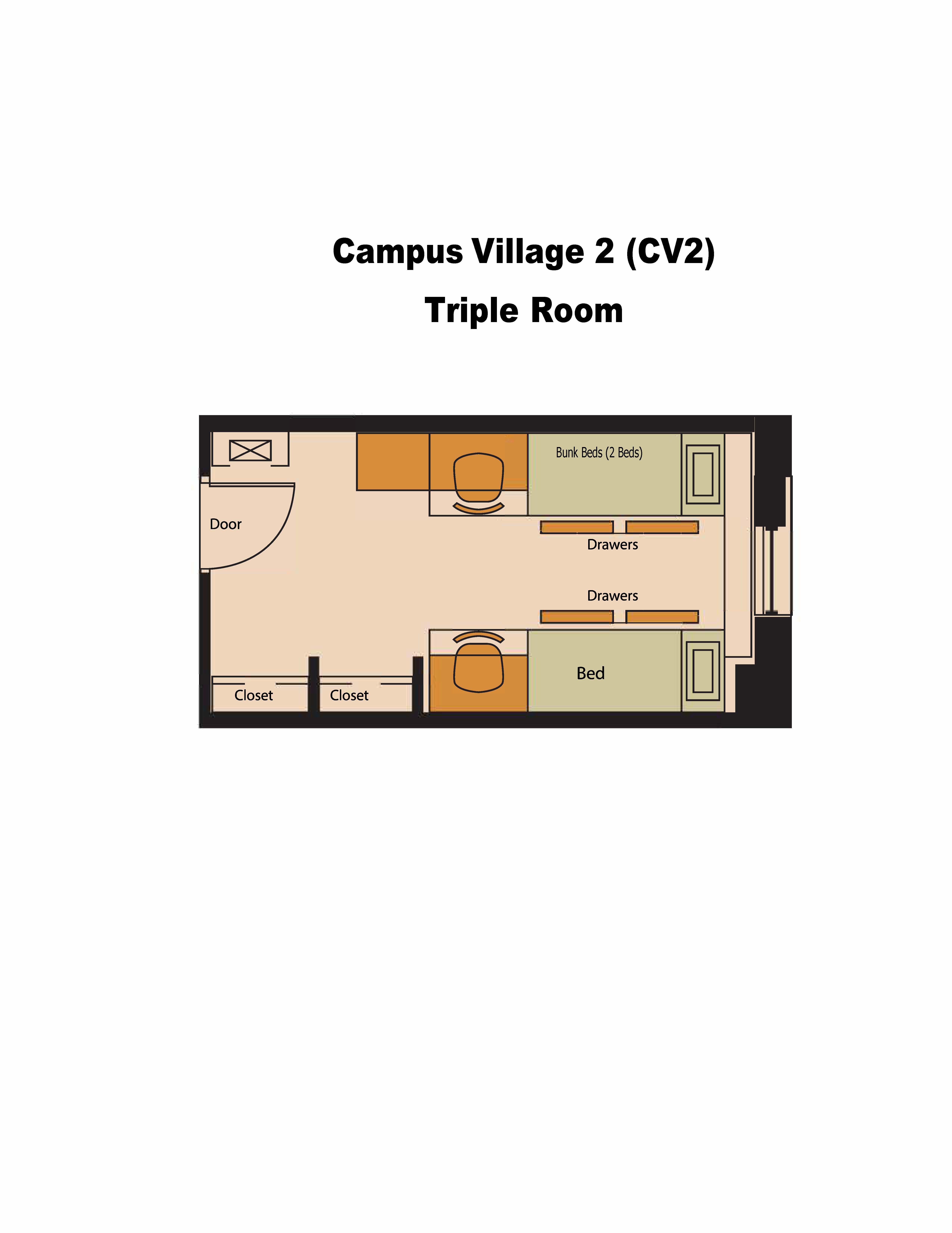 Double & Triple occupancy rooms are designed and furnished for 2 people (for Doubles) and 3 people (for Triples). Housing rent includes basic utilities and Wi-Fi internet access. All residents of Campus Village 2 must purchase a membership meal plan.  Double occupancy rooms have one set of twin, extra long beds, which can either be bunked or separated. Triple occupancy rooms have three sets of twin, extra long beds. Two sets will be bunked and the 3rd set will be lofted. Please note that beds are not furnished with pillows, blanket, or other linen.