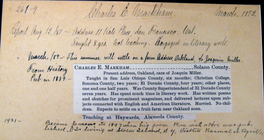This is Mr. Markham's "placement card" maintained by the California State Normal School. These cards tracked the graduation and movement/career of the graduates.